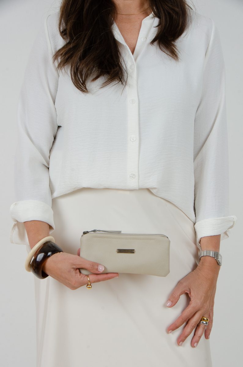 Monedero organizador muy práctico para mil y una utilidades, confeccionado en tejido de tapicería efecto piel en color arena