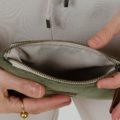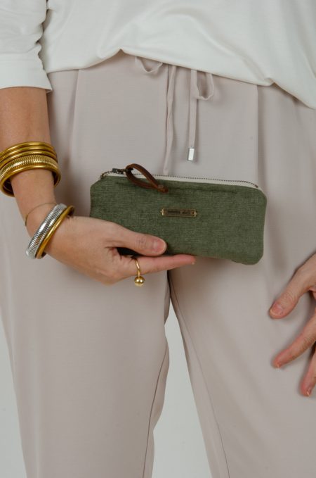 Monedero organizador muy práctico para mil y una utilidades, confeccionado en tejido de tapicería en color verde caqui.