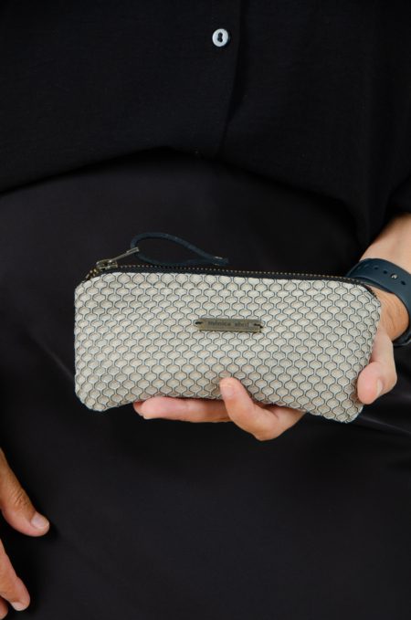 Monedero organizador muy práctico para mil y una utilidades, confeccionado en tejido de tapicería tipo neopreno en color piedra.