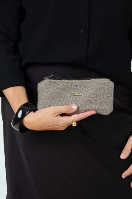 Monedero organizador muy práctico para mil y una utilidades, confeccionado en tejido de tapicería efecto lana en color taupe.