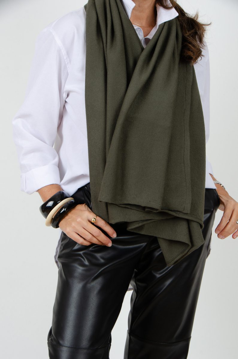 Poncho de viscosa en color verde caqui con tacto suave y abrigado con caída fluida que estiliza cualquier look.