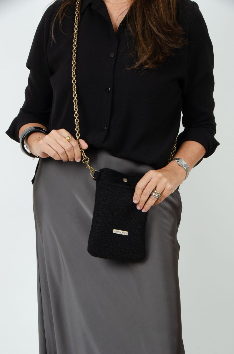 Bolsito para el teléfono confeccionado con tejido de tapicería efecto lana en color negro.