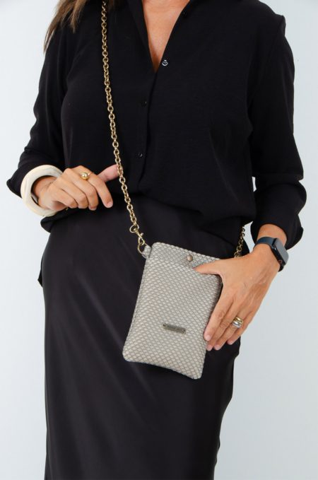 Bolsito para el teléfono confeccionado con tejido de tapicería tipo neopreno en color piedra.
