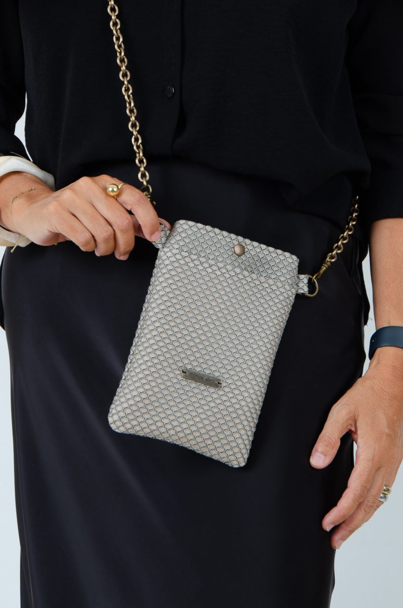 Bolsito para el teléfono confeccionado con tejido de tapicería tipo neopreno en color piedra.