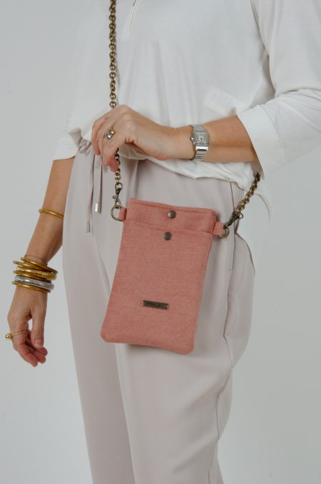 Bolsito para el teléfono confeccionado con tejido acolchado de tapicería en color rosa nude.