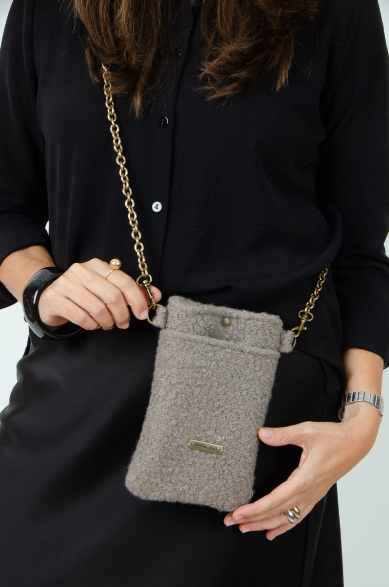 Bolsito para el teléfono confeccionado con tejido de tapicería efecto lana en color taupe.