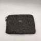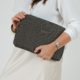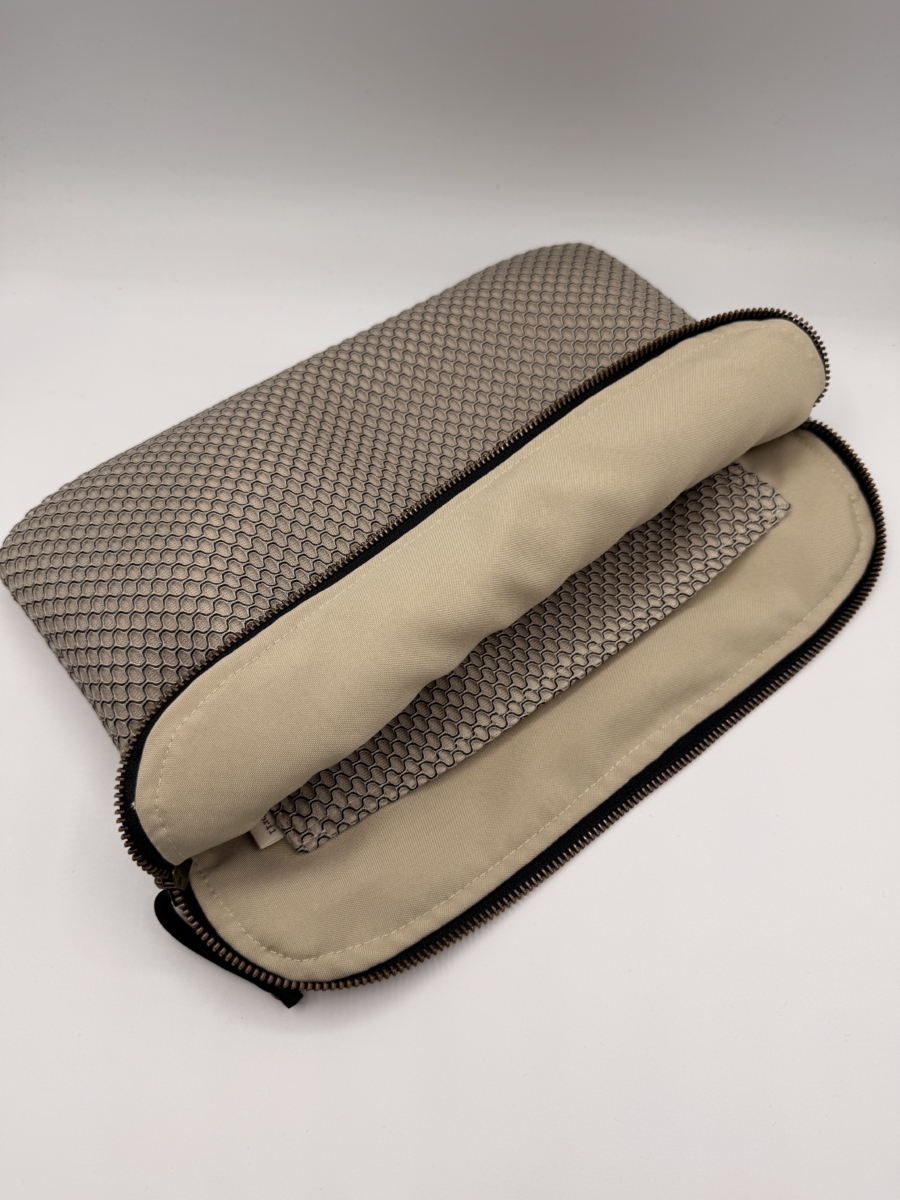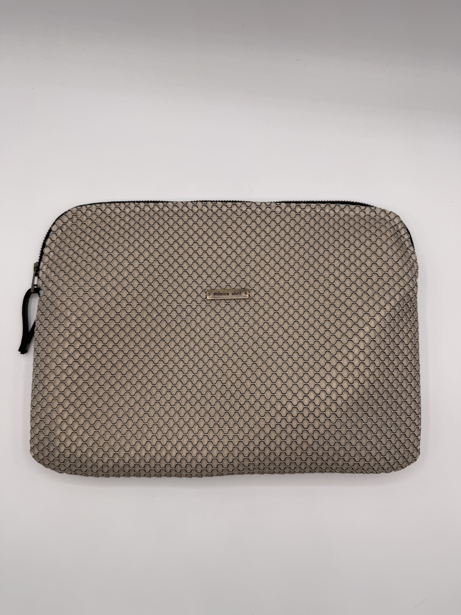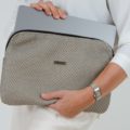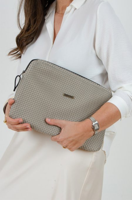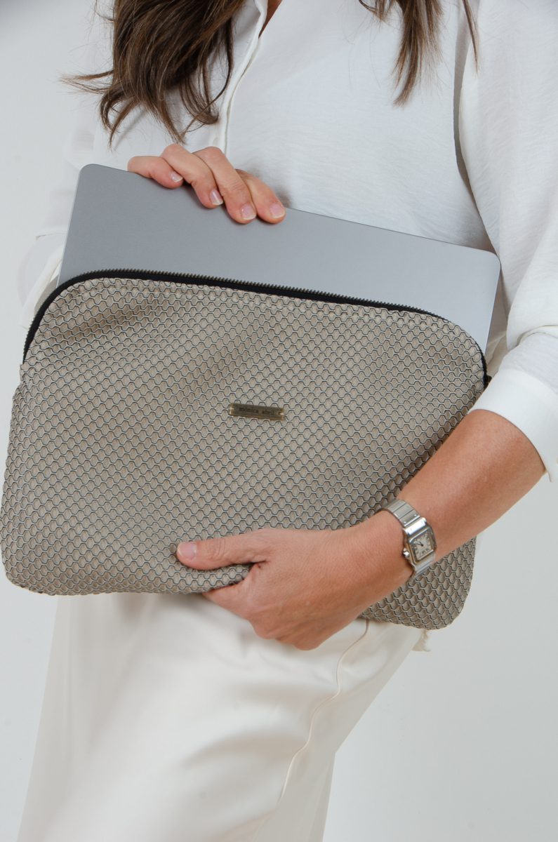 Funda de ordenador confeccionada en tejido de tapicería tipo neopreno en color piedra .