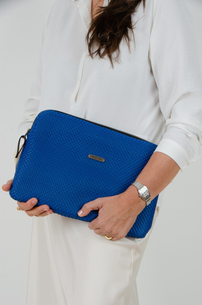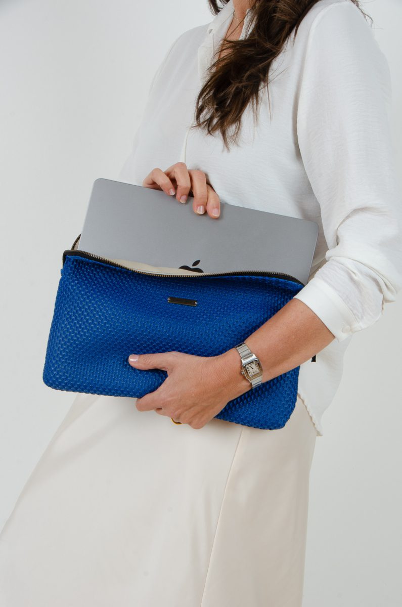 Funda de ordenador confeccionada en tejido de tapicería tipo neopreno en color azul klein .