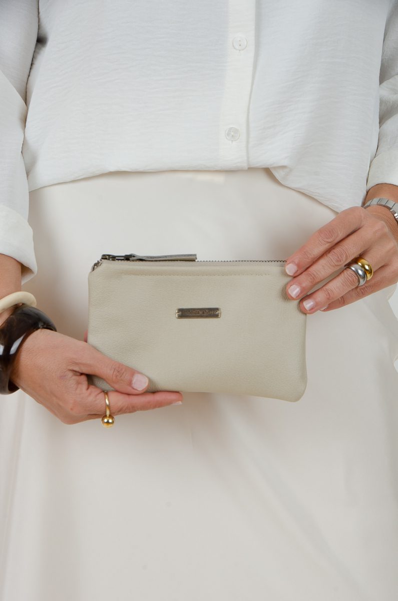 Monedero organizador muy práctico para mil y una utilidades, confeccionado en tejido de tapicería efecto piel de color arena.