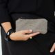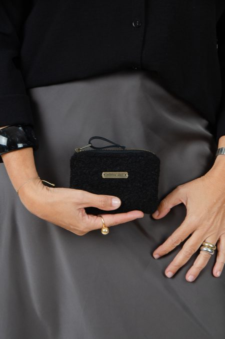 Monedero organizador muy práctico para mil y una utilidades, confeccionado en tejido de tapicería efecto lana en color negro.