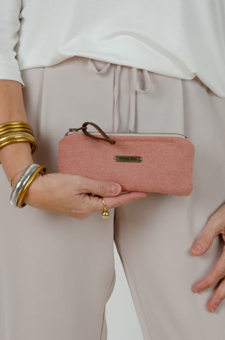 Monedero organizador muy práctico para mil y una utilidades, confeccionado en tejido de tapicería en color rosa nude.