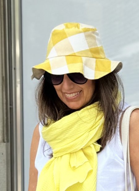 Gorro reversible en tela de algodón de cuadros en color amarillo y crudo, talla única.