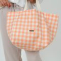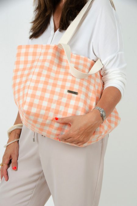 Bolsa tipo shopping bag con bastante capacidad confeccionada en bonito tejido de cuadros en color naranja y crudo.