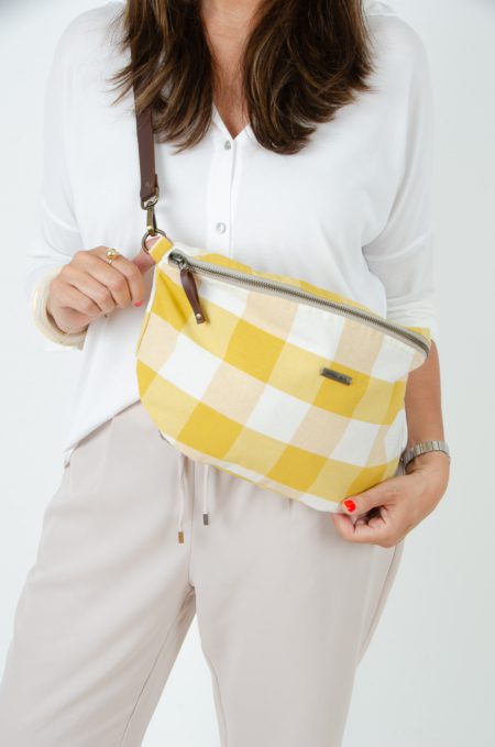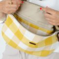 Bolso tipo riñonera de gran capacidad confeccionado con tejido de tapicería de cuadros en color amarillo y crudo, lleva cierre de cremallera y tirador en piel marrón.