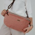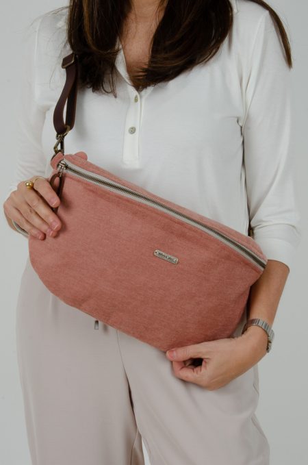 Bolso tipo riñonera de gran capacidad confeccionado con tejido de tapicería en color rosa nude, lleva cierre de cremallera y tirador en piel marrón.