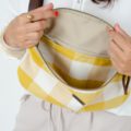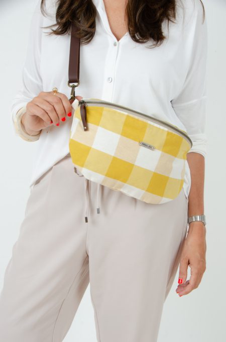 Bolso tipo riñonera confeccionado con tejido de tapicería de cuadros en color amarillo y crudo, lleva cierre de cremallera y tirador en piel marrón.